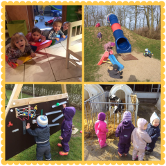 Omkring kl. 14.45 spiser vi eftermiddagsmad, hvorefter vi igen leger inde eller ude, indtil børnene bliver hentet.