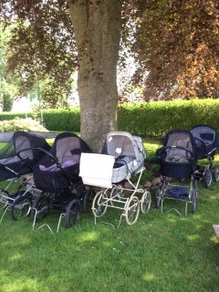 Middagsluren i barnevogn foregår i den overdækkede del af gårdhaven eller under den store rød-bøg i haven på en varm sommerdag.