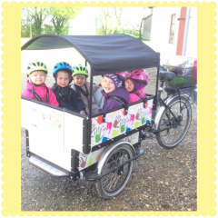 Jeg har en el-lad-cykel med plads til 6 børn, som vi bruger rigtig meget. Vi cykler ofte en tur i skoven, til stranden, på biblioteket, til tumlen i gymnastiksalen på skolen, til musikalsk legestue i Ullerup kirke og til sjov leg og samvær med de øvrige private børnepasserer i området.